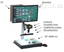 Prohlédněte si fotografie Digitální průmyslový mikroskop U3, objektiv 75 mm, monitor na sestavě